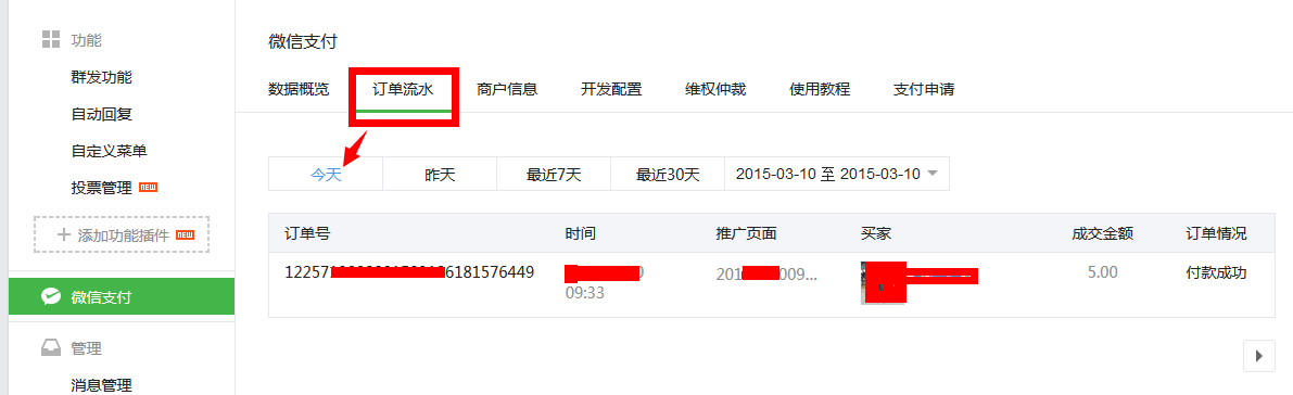支付成功之后,可以到我们的微信公众平台里的【订单流水】查看是否交易成功了。[如图] 新版订单查看需登录到https://pay.weixin.qq.com/