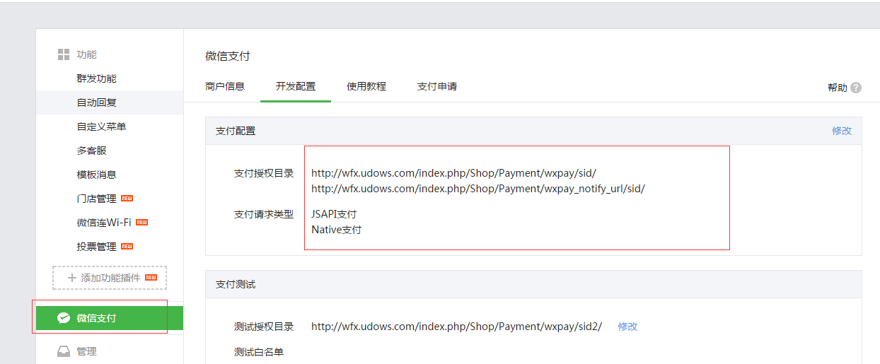 支付授权目录要填两个: wfx.udows.cn/index.php/Shop/Payment/wxpay/sid/ wfx.udows.cn/index.php/Shop/Payment/wxpay_notify_url/sid/ 支付授权目录统一填写[2016-04-05后 统一修改]:wfx.udows.cn/
